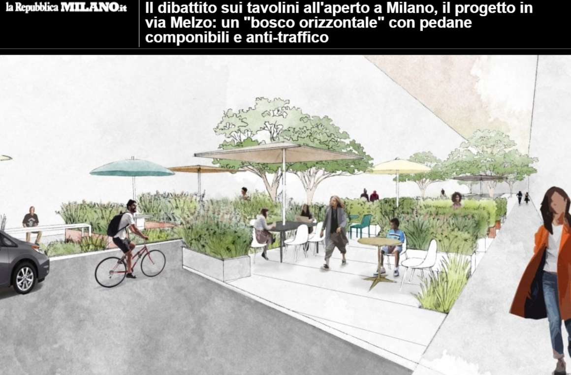 REPUBBLICA.IT 2020-07-01 Link "Il dibattito sui tavolini all'aperto a Milano, il progetto in via Melzo: un "bosco orizzontale" con pedane componibili e anti-traffico"
