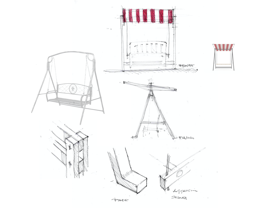 Dondolò è composto da profili e barre metalliche, assemblati con viti a testa svasata e saldature a sopracciglio, e nella parte superiore è coperto da una tettoia parasole realizzata con il tessuto Strange Love di Dedar.