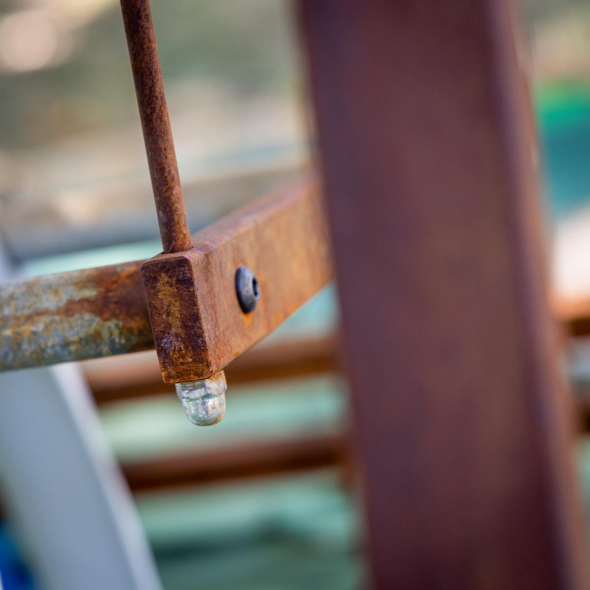 Dondolò è una seduta da esterno che impiega un manufatto preesistente inserendolo all'interno di una struttura di carpenteria appositamente progettata che permette un leggero movimento di dondolio.