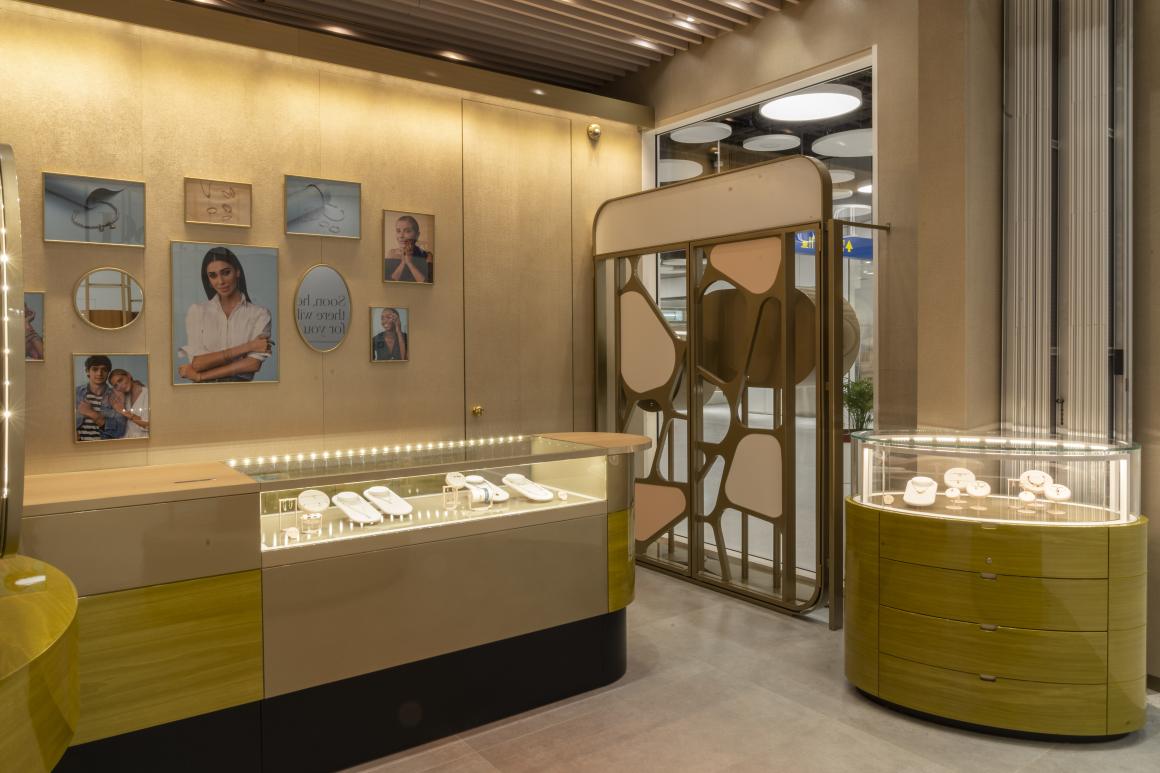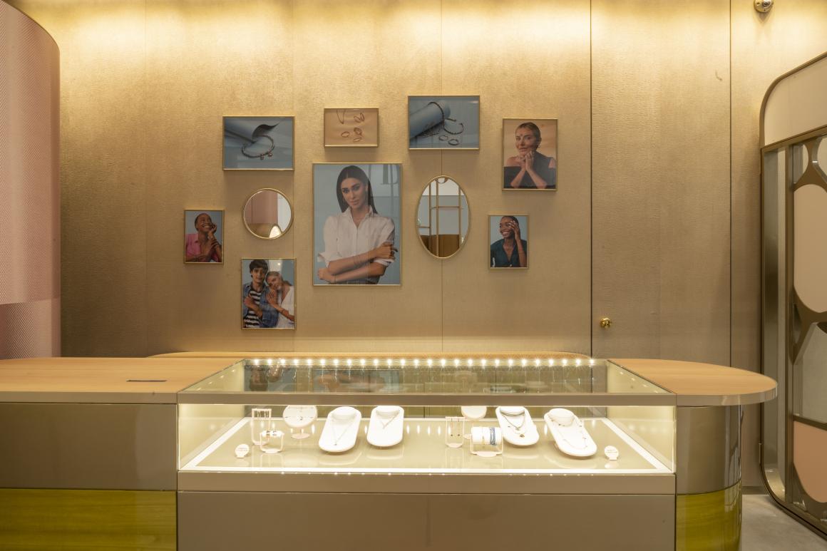 All’ingresso si trova un importante display centrale con strutture tubolari alte fino al soffitto. Il legno laccato verde Bolivar del bancone e la carta carta da parati customizzata, a effetto ottico bianco e rosa sono gli altri elementi di design che contribuiscono a rendere lo spazio accogliente.