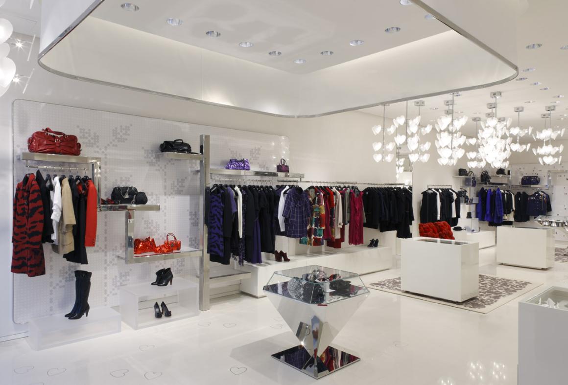 Lo spazio è di un bianco incontaminato, con strutture espositive ad albero, tavoli a forma di diamanti sovradimensionati, enormi borse da donna riutilizzate come sedie e apparecchi di illuminazione a forma di cuore che scendono dal soffitto. All'interno di queste boutique, arredi speciali e fantasiosi, alcuni disegnati da Moschino, si fondono con elementi funzionali per creare un'atmosfera incantevole che suggerisce un senso di piacere.