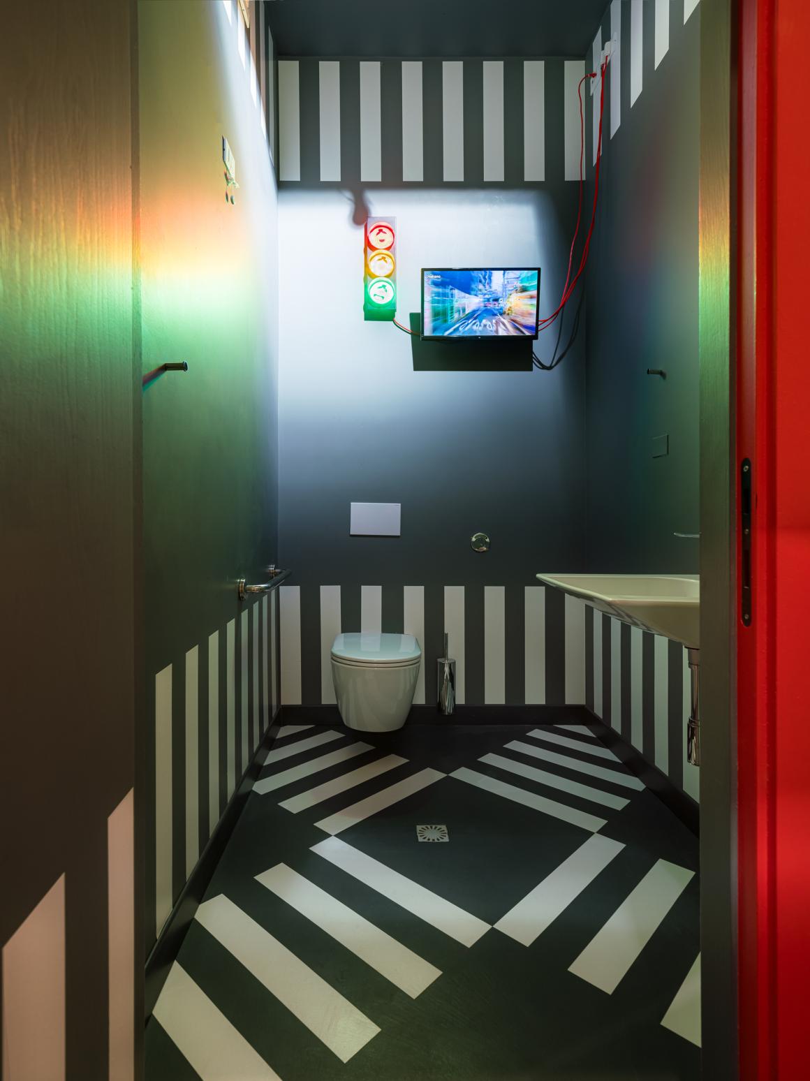 Recalling the Japanese tradition are the light wall bookcases, custom-made: a reinterpretation of fusuma and shoji, panels and sliding doors that delimit the spaces of the typical homes of the Rising Sun. Colour plays a significant role in defining the space and guides all the interior design choices, from the lighting to the furnishings to the graphics on the walls. Giving an even more pop touch is the use of jeans, a fabric of which Japan boasts a production of excellence.