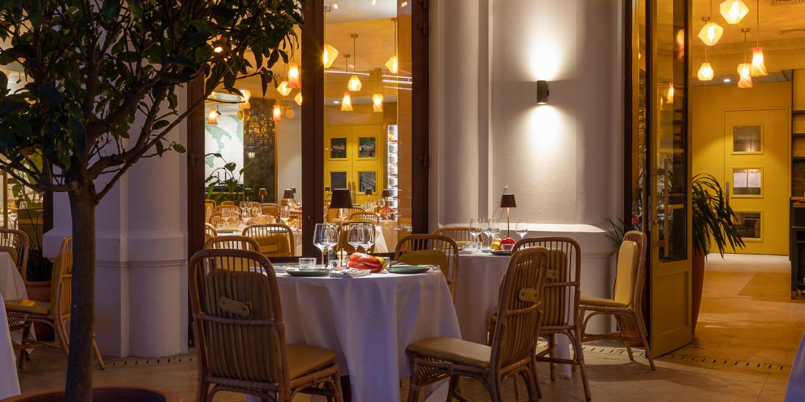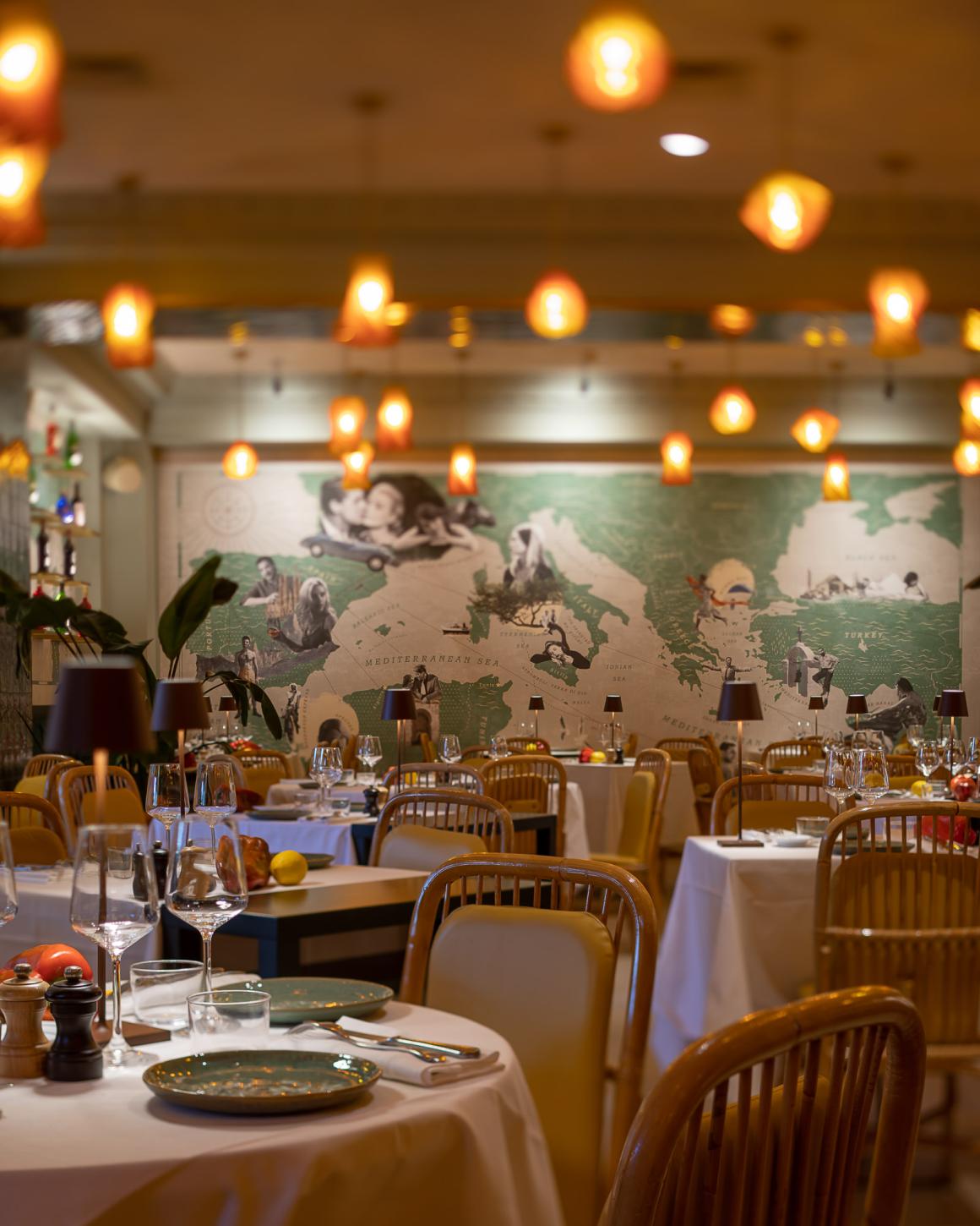 Different elements come from the Mediterranean atmosphere as the green of olive, caper and sage leaves, the yellow and orange of citrus fruits and the beige of the stone blend with ceramic tiles, rattan, Sicilian stone, brass, velvet and silk. On the wall, a wallpaper reproducing a map of the Mediterranean and iconic films that have been shot there reminds of the deep connection between Le Majestic and cinema. The orange chandeliers, made of recycled plastic, have been designed and manufactured exclusively for the restaurants.