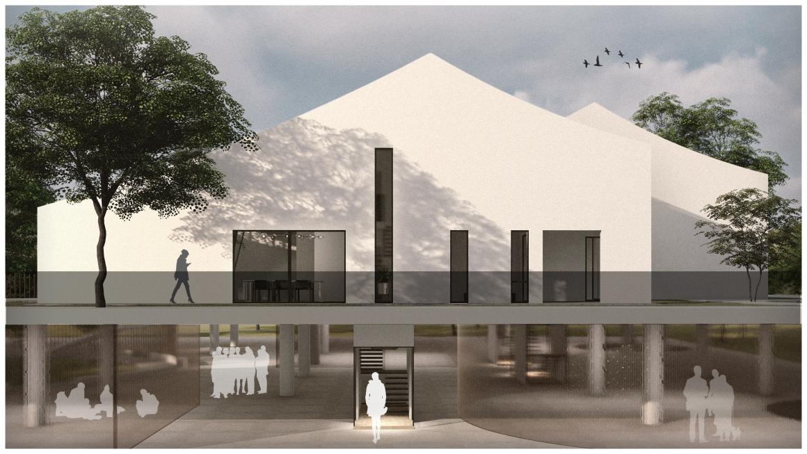 Living Core's shell is inspired by traditional Chinese houses. A photovoltaic roof features a glass cone β a plant 'aquarium' for light and recycled water β above a prefabricated core containing all essential fixtures. Rooms are arranged around this central unit. The design allows units to form neighborhoods with public social and work spaces. Like the light-bringing glass voids, ground-level patios create public gardens and gathering points. The underground level becomes a new ground plane for workshops, offices, and services.