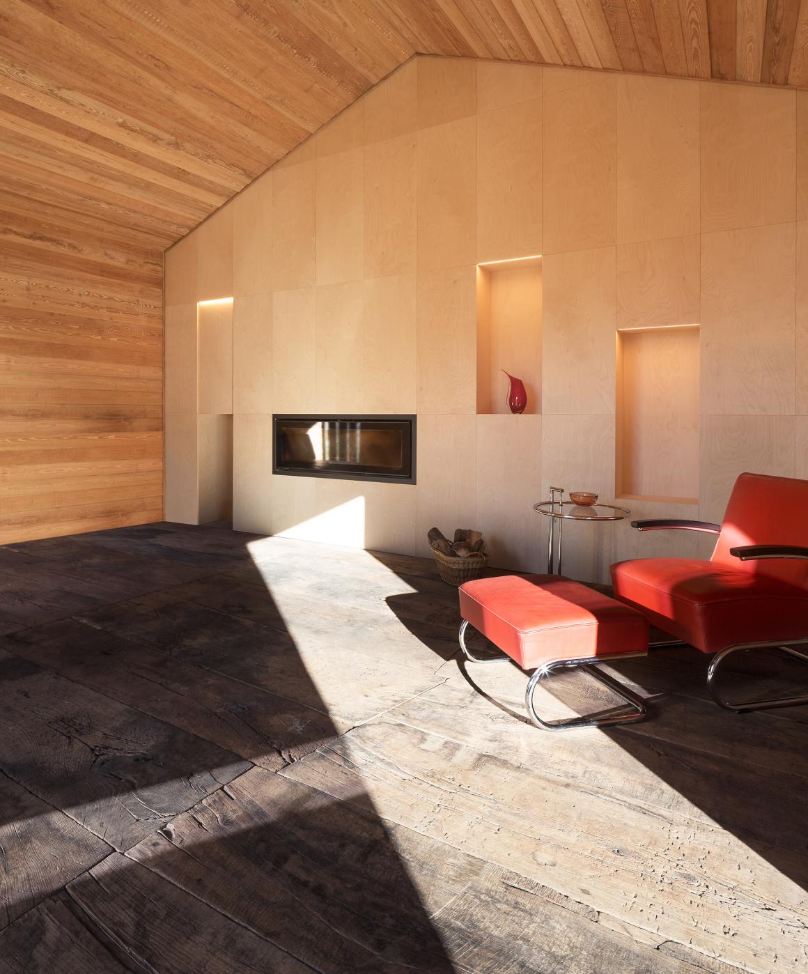 Inside, the design orchestrates a dialogue between three key elements: the warmth of wood (oak/birch plywood flooring, larch planks/restored original chestnut flooring), the generous flow of space and sunlight, and the breathtaking panoramic views.