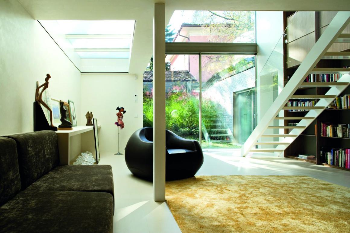 A stunning building from the 1960s in the Italian Alps, transformed by a glass tower to connect all three levels and bring the outdoor garden inside.