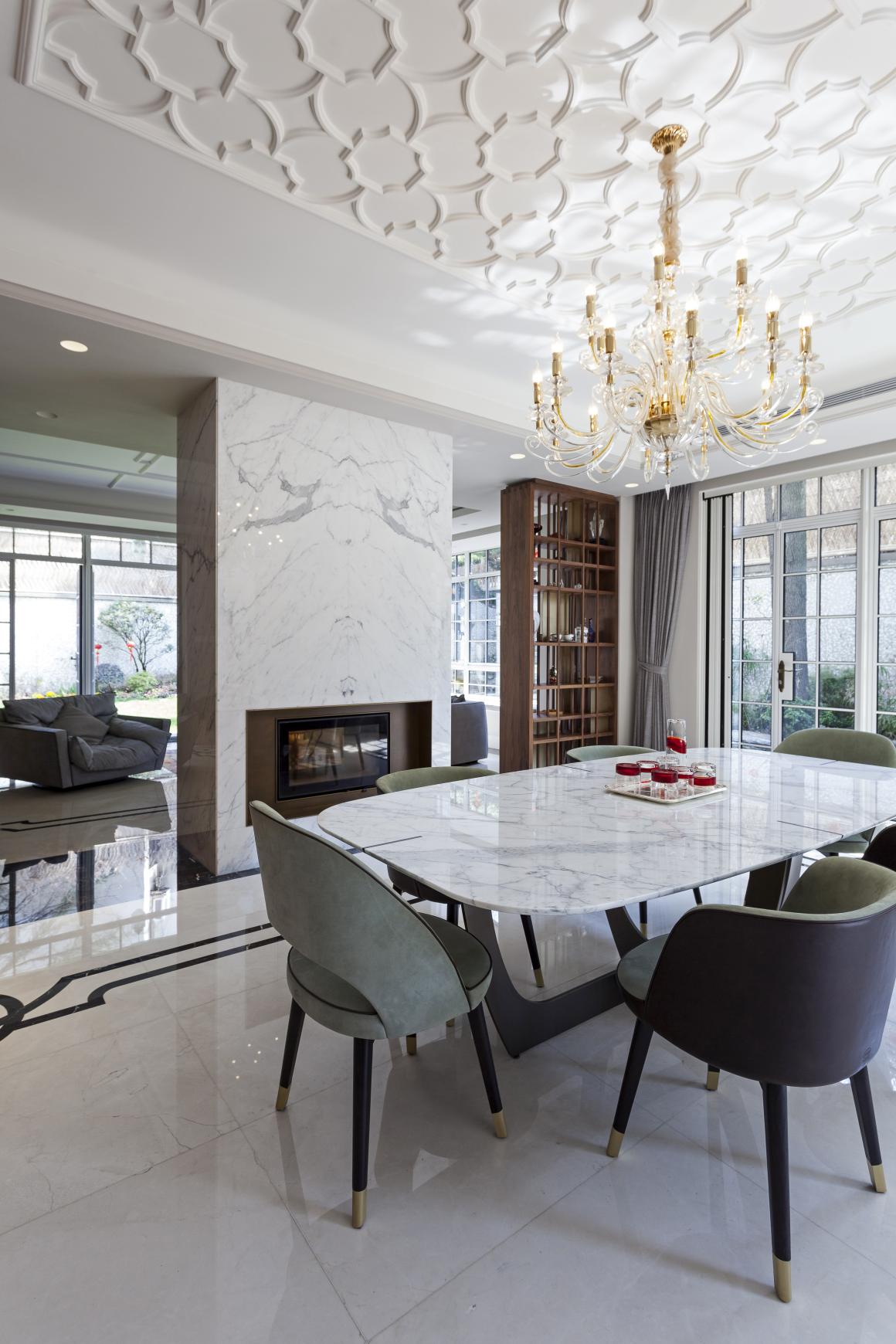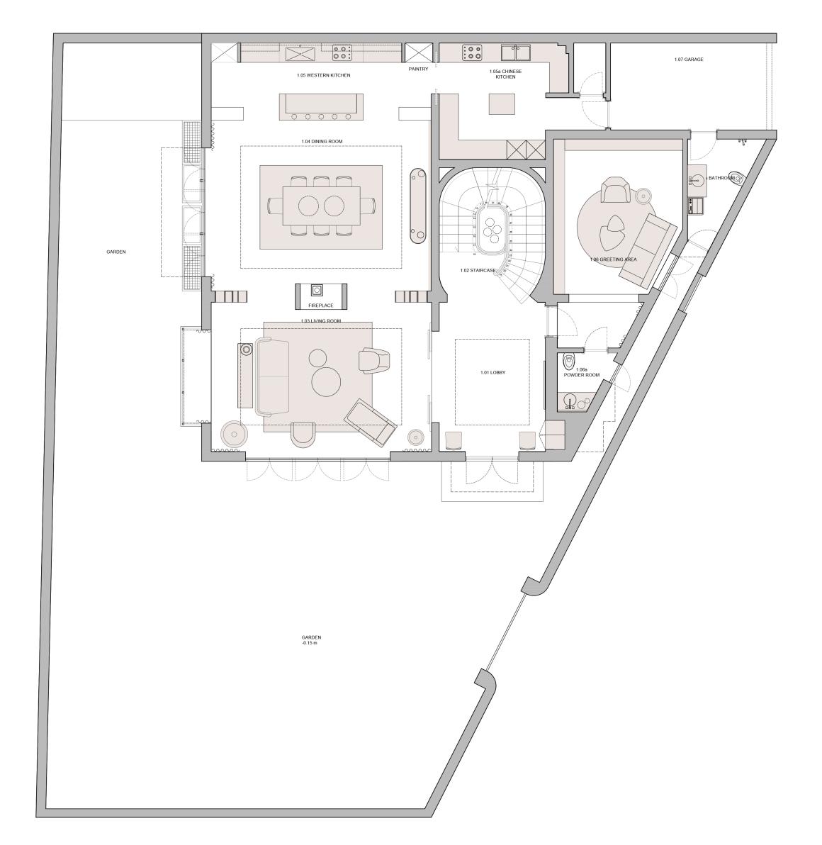 The architecture of the façade has been defined after a careful analysis of the materials used in the old Shanghai of the 1920: the mix of pale yellow marmorino, river pebbles and grey stone create a perfect harmonious balance, enhancing the elegance of the building. The interior architecture continues the analysis of the past and propose a timeless environment: the elegant wooden ribbon of the main staircase, the marbles of the floorings, the colors of the walls, the wooden/brass libraries and the ceiling decorations define a cozy and welcoming space, where the client easily located her furniture selection.