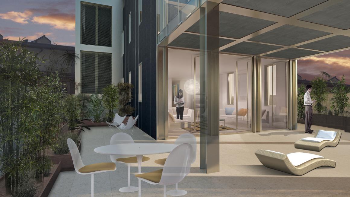 The reimagined facade along Via Volturno offers a fresh take on the existing curtain wall, employing a contemporary architectural vocabulary. It breaks away from its 19th-century neighbors through the introduction of perforated metal bow windows and green volumes, creating an interplay between interior and exterior spaces. The selected materials β anodized aluminum, slender vertical windows, and striking black clinker β nod to Milanese tradition with a touch of originality. The facade, punctuated by solids and voids, presents an introspective character, with the night area facing east and the day area facing west, enjoying expansive views of the transforming city and the Alps. Avoiding demolition, the design opts for a transformative addition, seeking a meaningful connection with the existing urban fabric, its ongoing evolution, and the broader natural horizon.