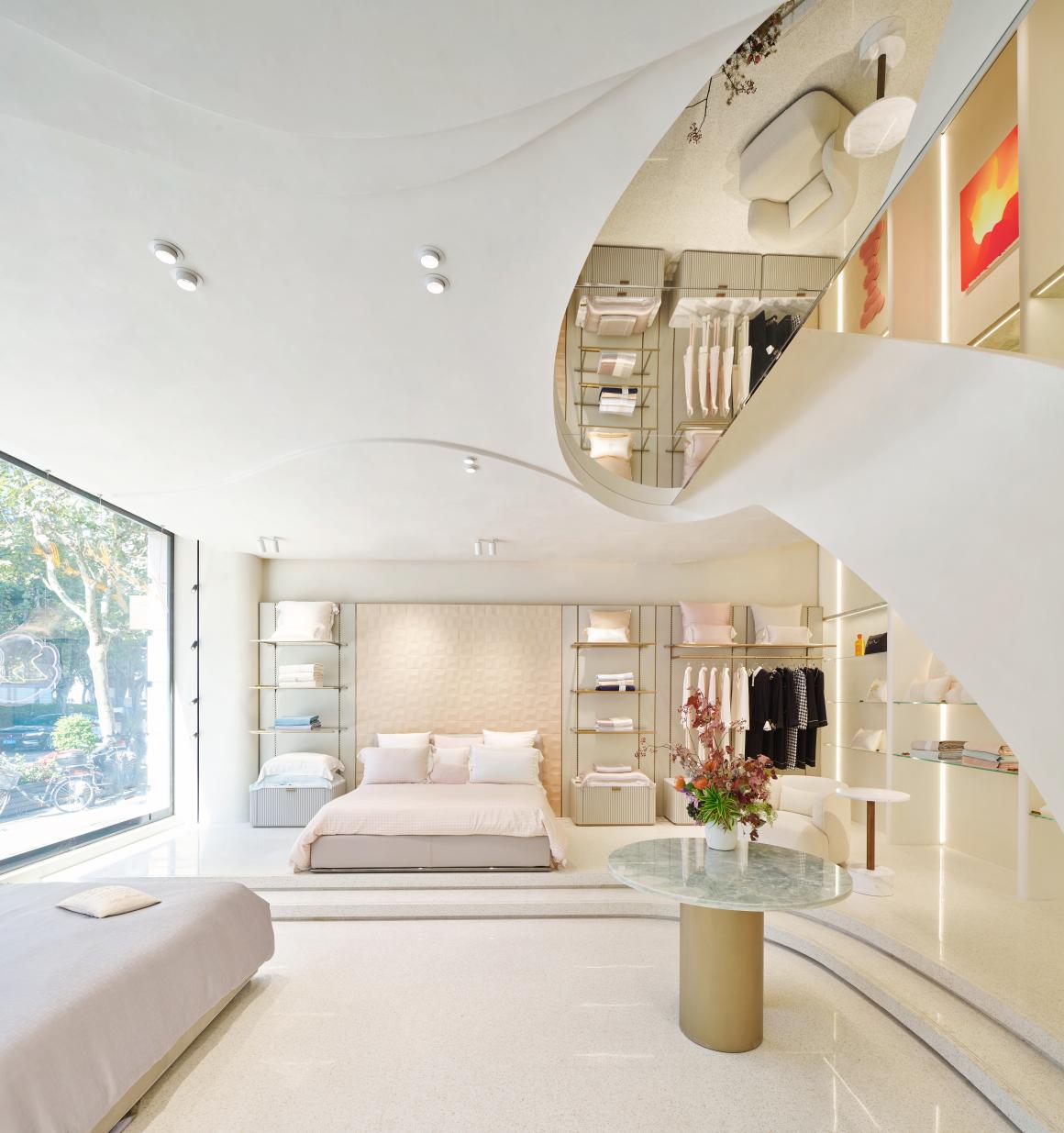 This Shanghai showroom for Frette and Silky Miracle, realized in collaboration with Hangar Design Group, harmonizes the brands' silk textures with the Tongren Street architecture's curved lines.