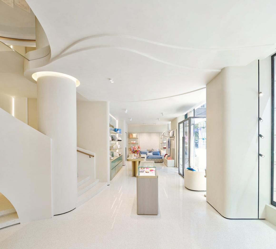 Ceiling gypsum waves, patterned marbles, and soft bed headers create a welcoming, comfortable atmosphere. A sinuous, cocoon-like staircase spirals to the second floor, facing an art wall. It's built around a central column, adorned with stucco and marble shelves. Upstairs, a guest bar with wavy wood paneling and two elegant fitting rooms enhance the shopping experience. A small, adaptable art gallery hosts collections and exhibitions. The soft, matte, and feminine color palette contrasts the colorful, glossy products.