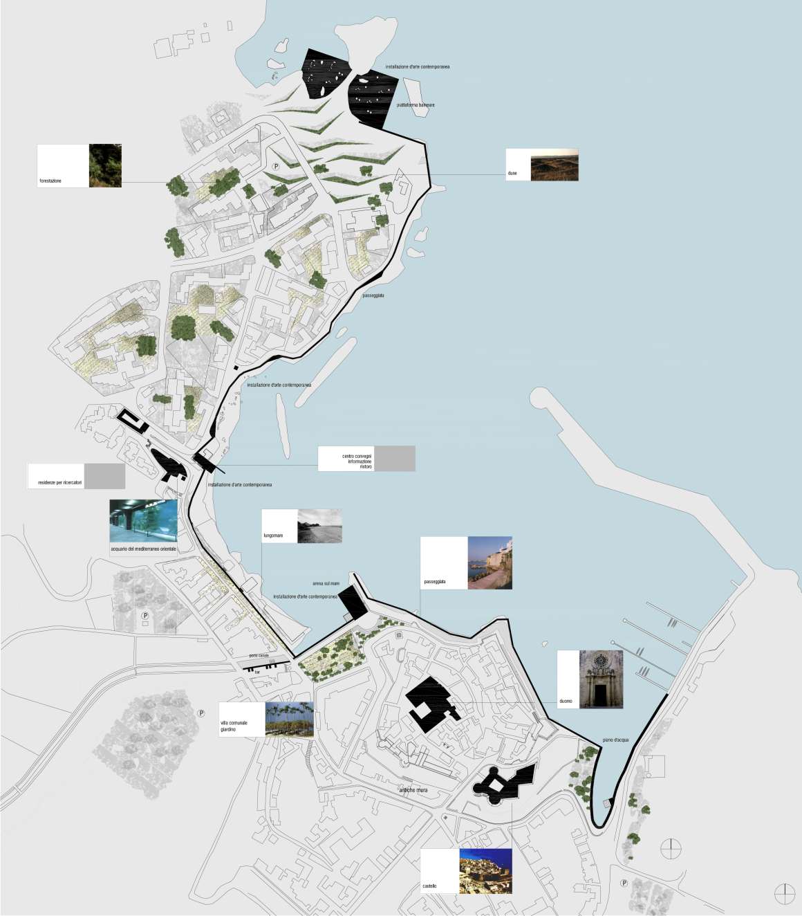 A coastal regeneration plan for the historical city of Otranto in Apulia, under the artistic direction of Ennio Capasa. Beginning at the tourist port and extending through both the old and new parts of town to the bay's lighthouse, the project introduces a pedestrian walkway that unlocks the entire coastline for public use. Along this path, various functional elements are integrated: a sea-facing amphitheater, a marina, a Mediterranean aquarium (with architecture and design by Ennio Capasa), a research center, and a boutique hotel.
