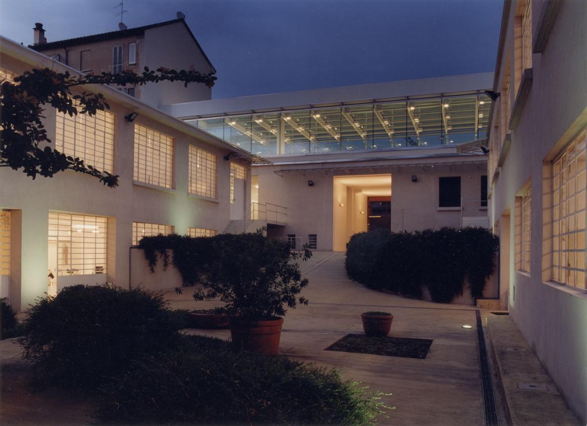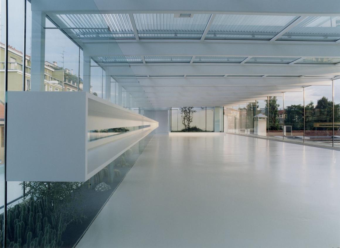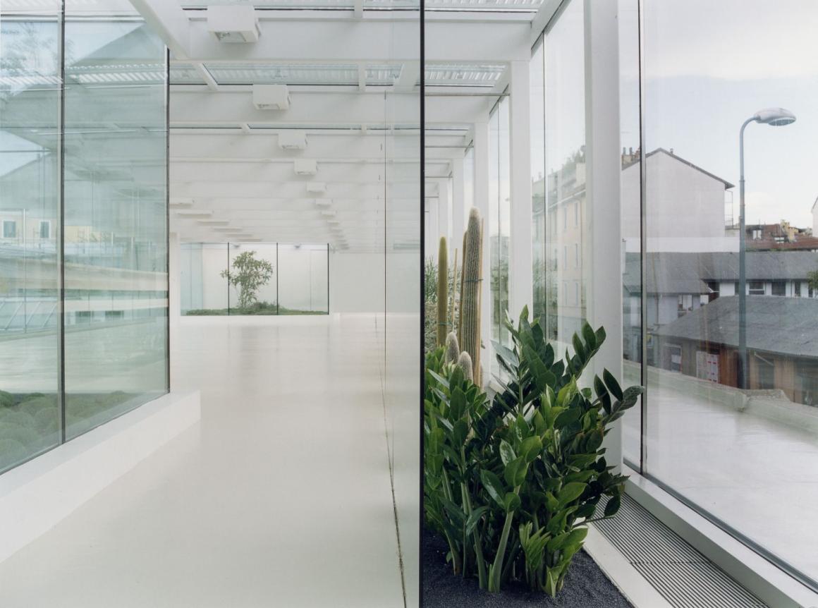 A large greenhouse. A transparent glass structure that speaks of the origins and cosmopolitan and contemporary nature of Costume National. Architecture that reminds the white structures in southern Italy and, at the same time, the modernism of 1960s Palm Springs, sun-drenched Mediterranean patios and historic functionalist rigor. The building is built on three large terraces over an existing showroom. The rest of the space has been transformed into pools that reflect the sky.