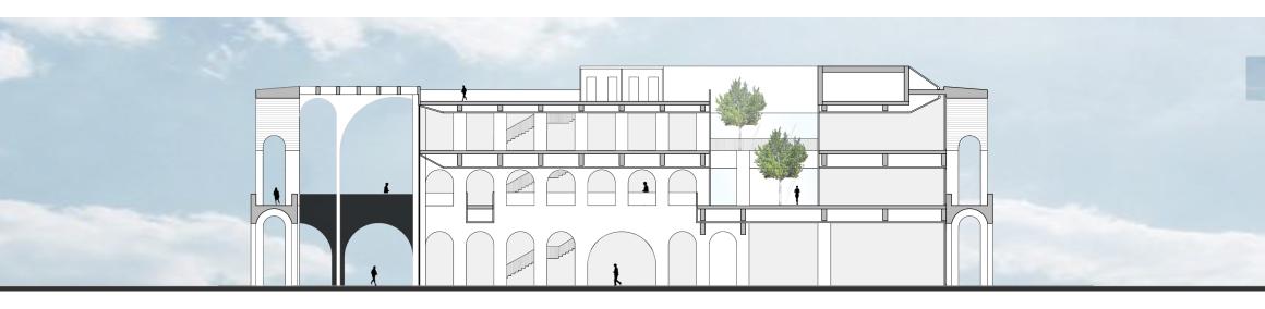 The project's central concept reimagines the arch, an iconic element of Italian architecture, as a key structural component. This creates a strong visual and structural connection between the exterior facades and the building's core. The facades are characterized by a rhythmic lower level of regular arches clad in metal, and an upper level defined by an irregular yet rhythmic arrangement of arches finished with white marmorino plaster. The top floor features an open terrace, evoking the Italian lifestyle and the tradition of hosting outdoor events.
