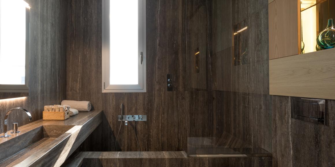 从入口处,住宅分为两层,继而延伸至通透明亮的起居区域,最终导向宽敞的露台。被绿植与加拿大雪松环抱的外部空间,既私密又受到天然庇护,俨然一个功能完备的"户外厅堂",成为住宅的公共核心区域。其余空间则通过光影变化、伊朗洞石、四种木材(榆木、橡木、白蜡木与落叶松)与四种金属(铅、锻铁、锌与黄铜)的材质交响,构筑起独特的空间韵律。