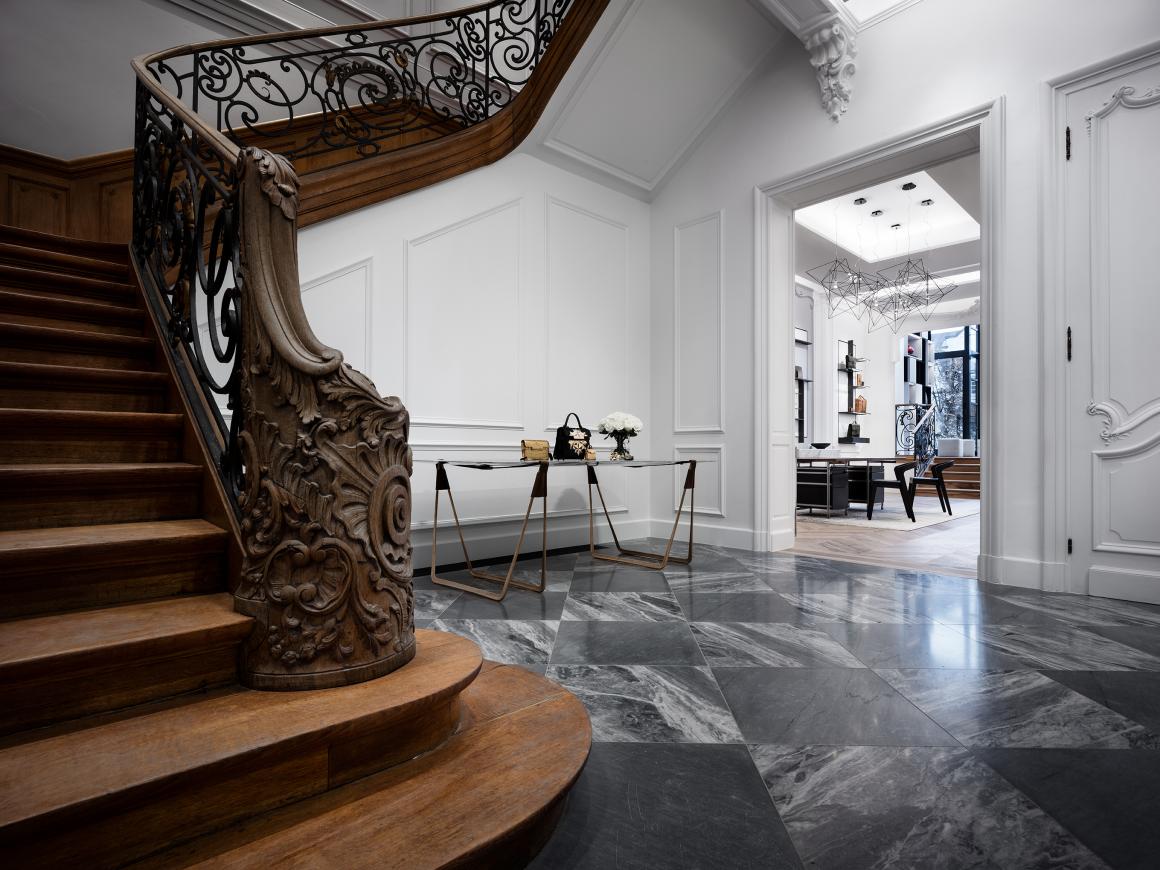 Delvaux 旗舰店“Le 27”呈现了一个独特且定制设计的概念,将当代设计与历史环境完美融合。这个横跨两层楼的店面保留了其原始的墙体结构和高耸的天花板,以现代视角诠释了20世纪早期的比利时现代主义。
