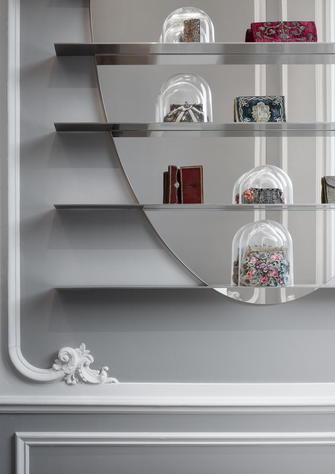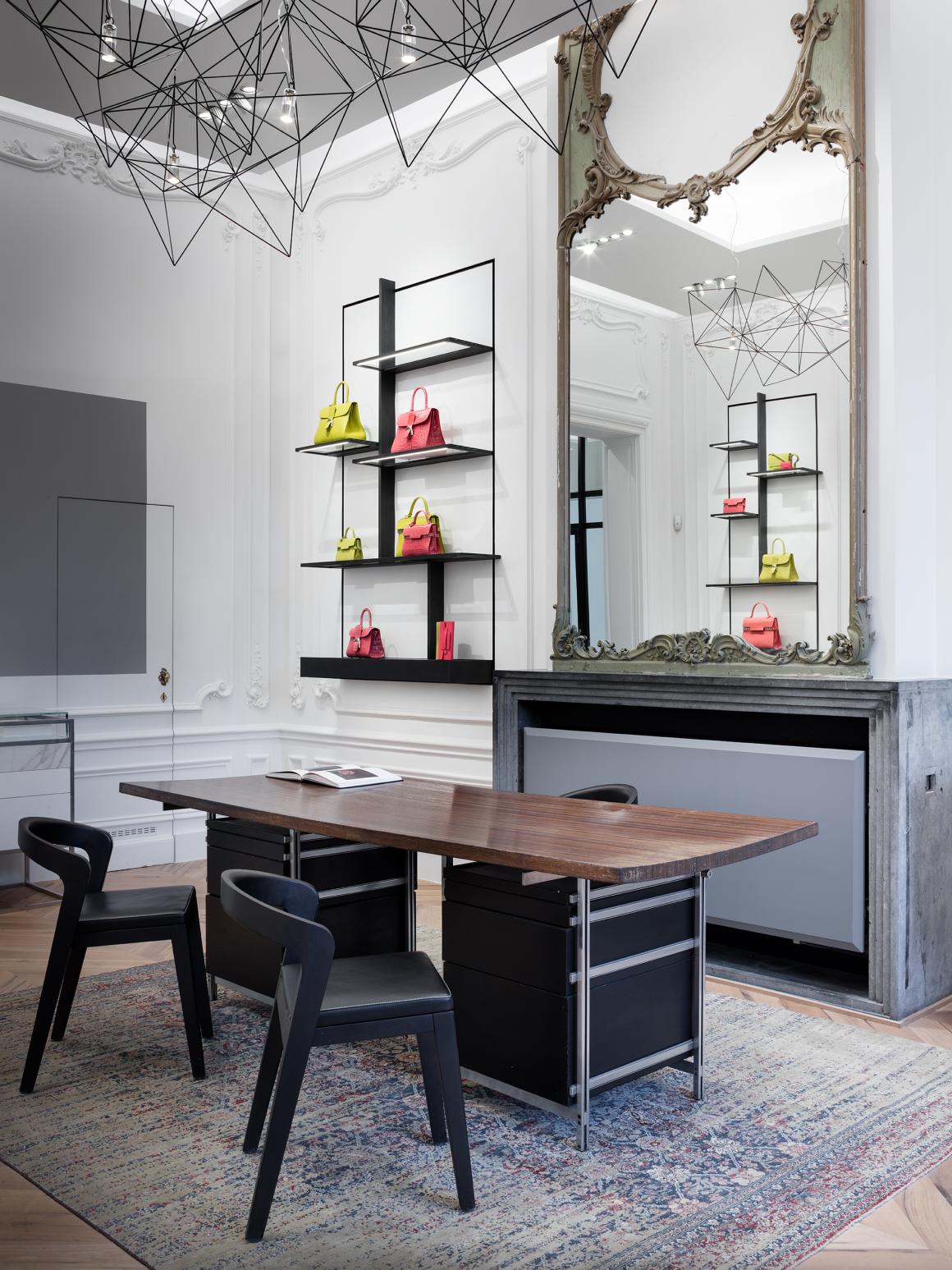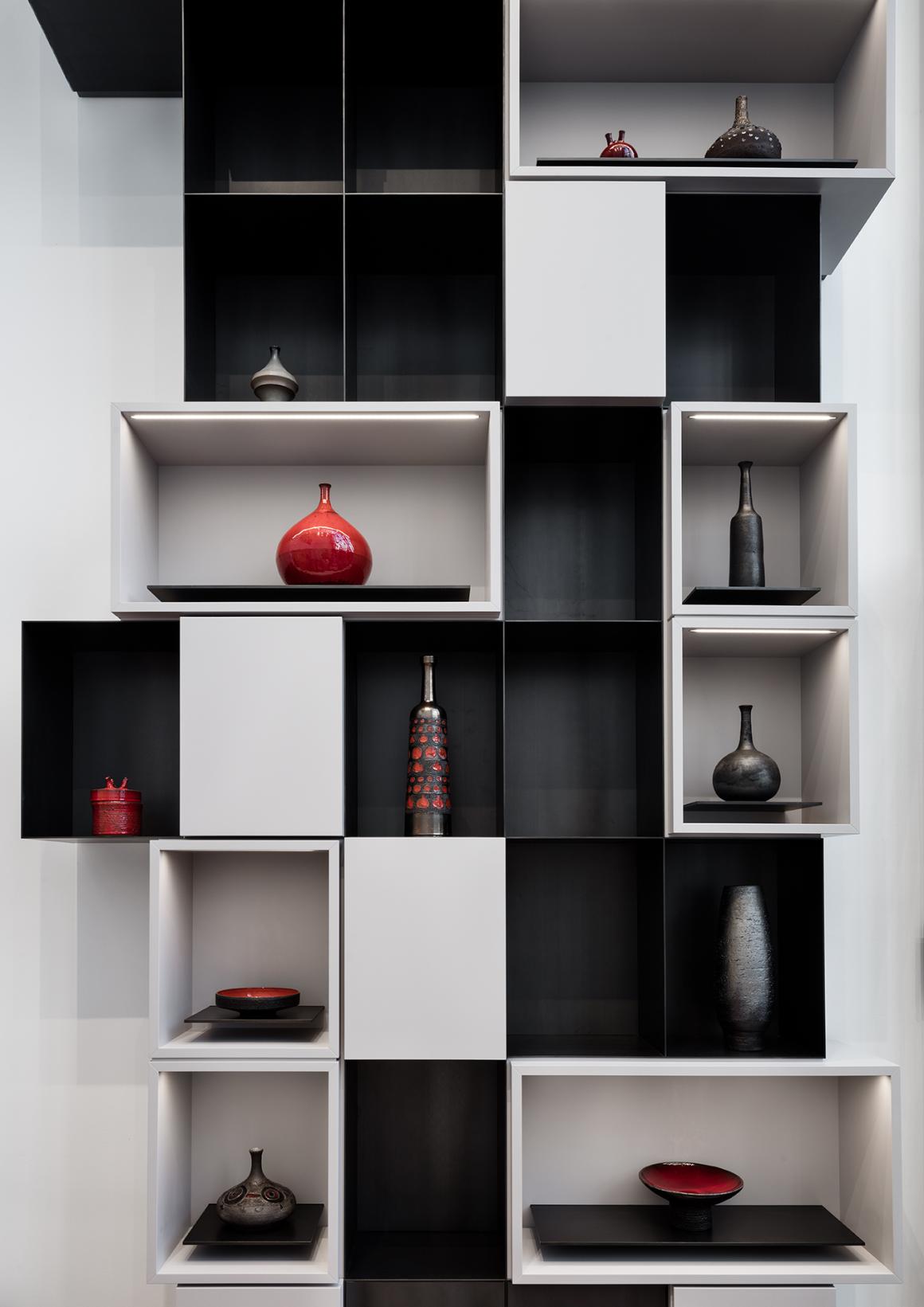 墙面展示灵感来源于“风格派”(De Stijl)和蒙德里安(Mondrian),其对称布局被非传统的浅灰色条带巧妙地打破。这些面板与极简造型的时尚柜子和置物台相结合,并辅以华丽的装饰艺术(Art Deco)材料,使其更显高级。两种元素中精湛的工艺巧妙地呼应了现代设计大师的理念以及 Delvaux 对细节精益求精的专业技艺。我们的设计通过看似简洁与奢华的材料,以及有序与非传统元素的对比,实现了经典与现代美学之间的平衡和谐。