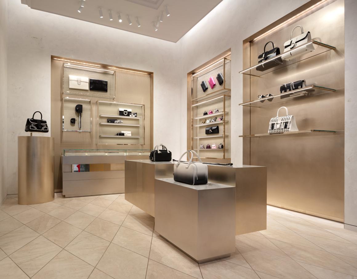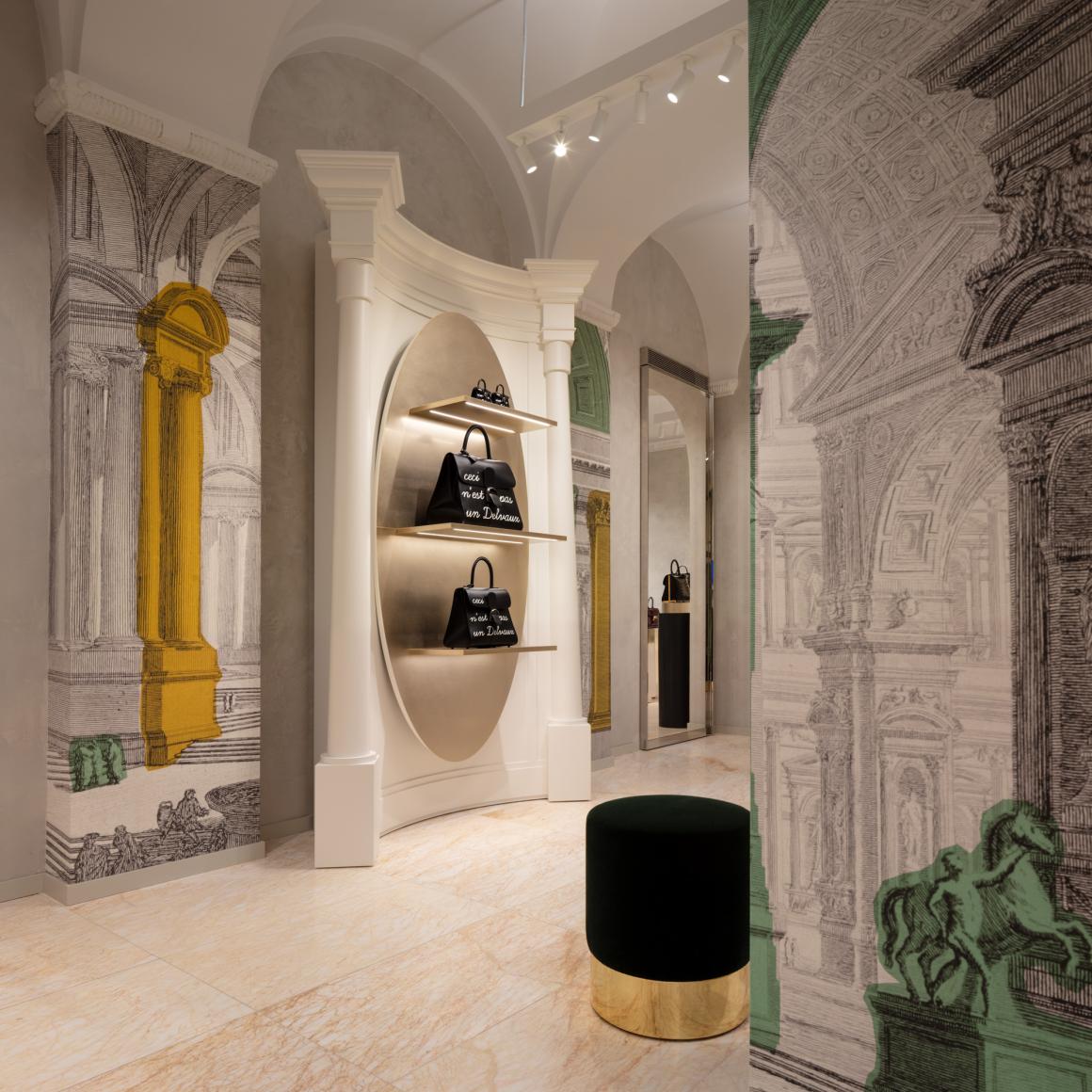 标志性的 Delvaux 衣帽柜,其形态、色彩和体量根据每家门店重新构思,在此次设计中则受到了巴洛克建筑师博罗米尼(Borromini)的启发。这一选择,加上金色背景的运用,旨在向永恒之城罗马致敬。最终呈现的门店拥有独特的、温暖而诱人的个性,其中丰富的引用和暗示引导着宾客探索 Delvaux 的系列产品及其独特的“比利时风情”(Belgitude)。