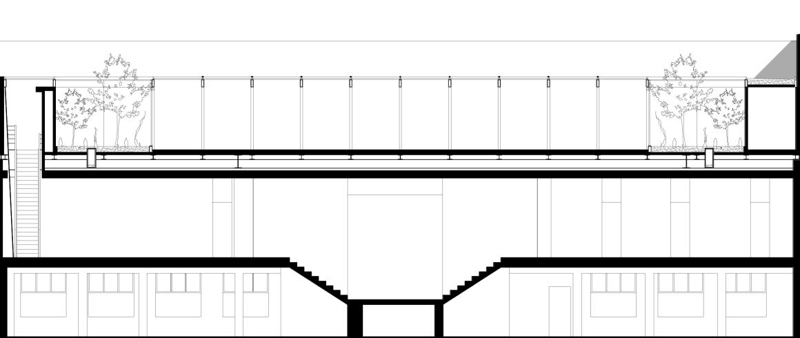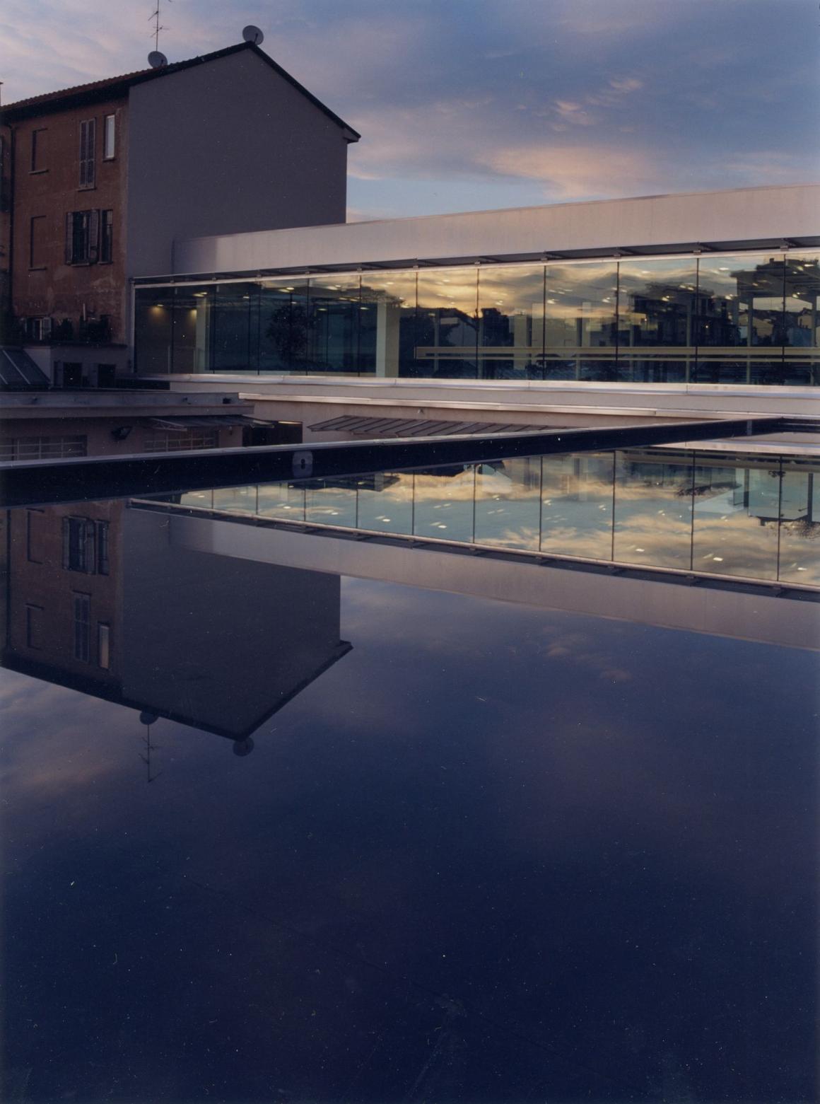 Una grande serra. Una struttura in vetro trasparente che parla delle origini e della natura cosmopolita e contemporanea di Costume National. Un'architettura che ricorda le strutture bianche del sud Italia e, allo stesso tempo, il modernismo di Palm Springs degli anni '60, i patii mediterranei assolati e il rigore storico funzionalista. L'edificio è costruito su tre grandi terrazze sopra uno showroom esistente. Il resto dello spazio è stato trasformato in piscine che riflettono il cielo.