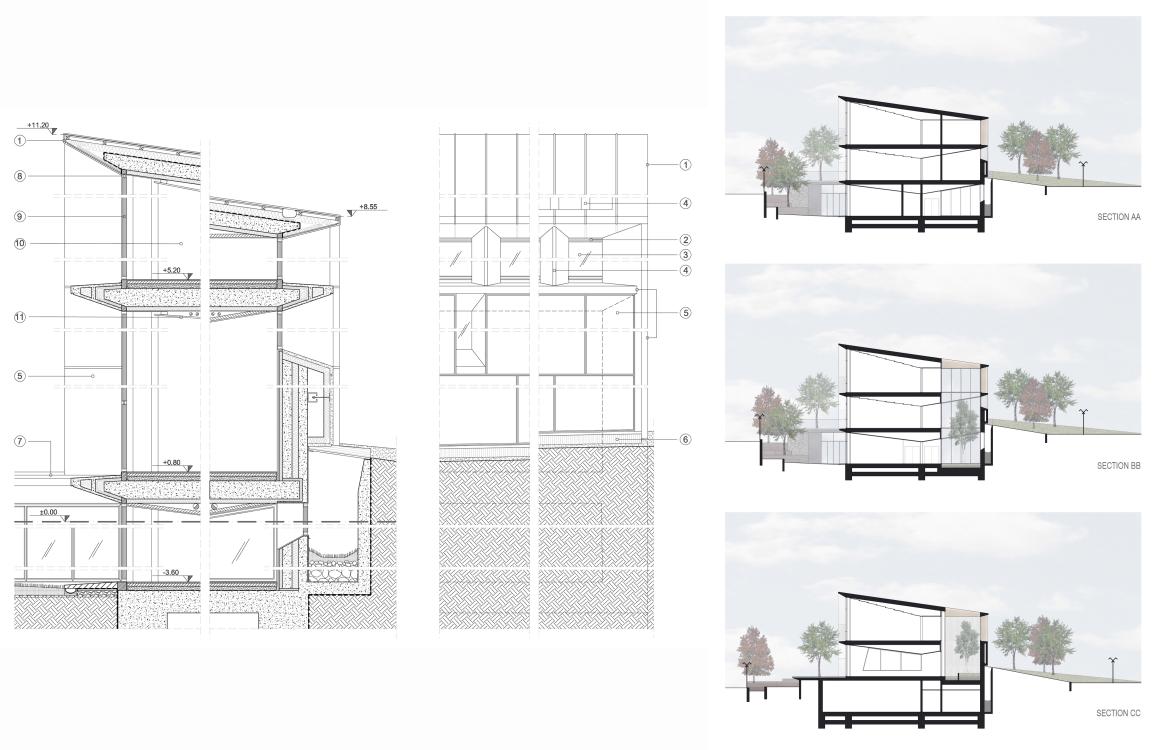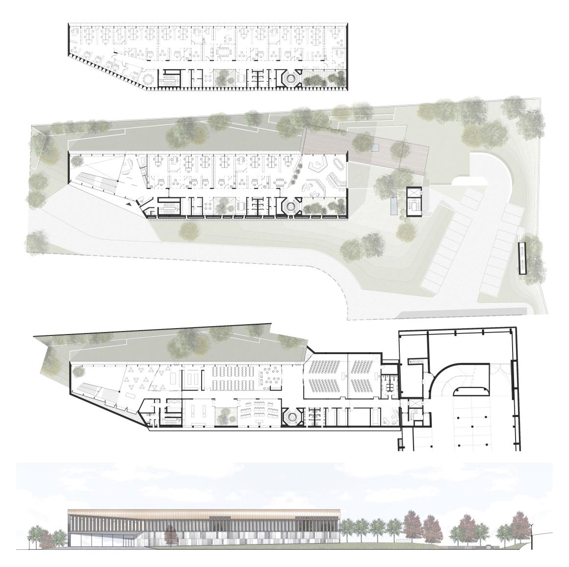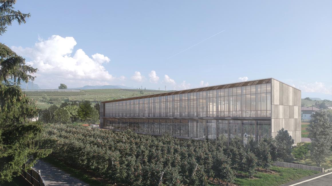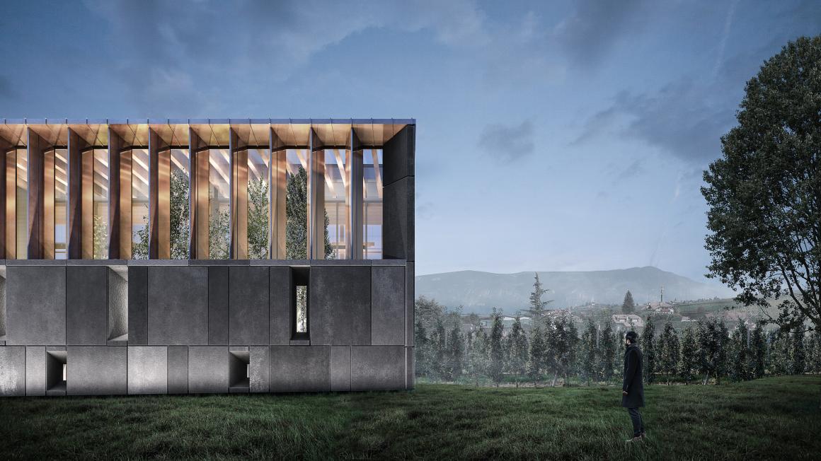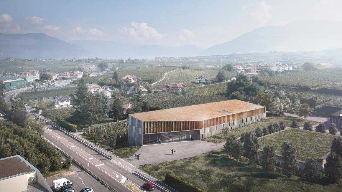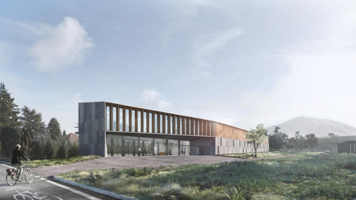 La forma del nuovo edificio è un parallelepipedo pulito con angoli fortemente stondati, per aumentare la visibilità e la vista, che si adagia e si incunea nella collina. Un'architettura di alta qualità e chiarezza, con un nucleo interno caldo e accogliente, realizzato con materiali naturali come legno e pietra, e una facciata esterna in cemento grigio, vetro e metallo.