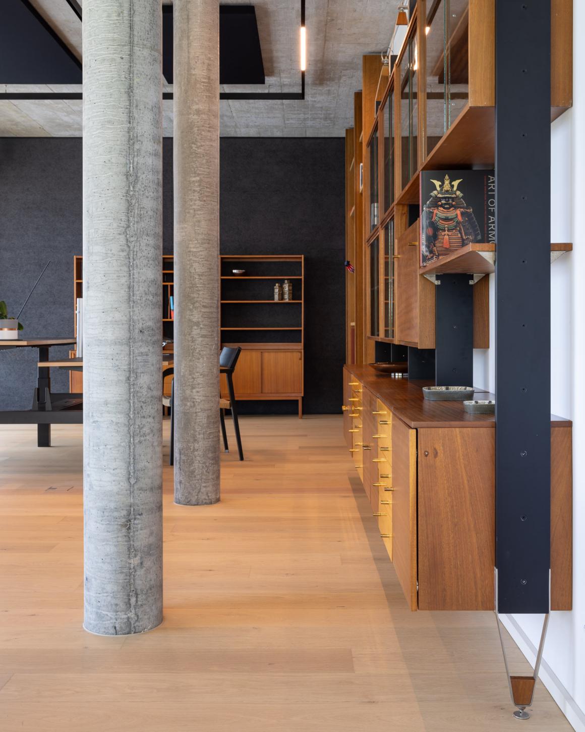 Il layout si sviluppa attorno a un nucleo centrale in cemento armato, che funziona da ancoraggio strutturale e spaziale del progetto. Per valorizzare al massimo la luce naturale, l'ufficio presenta vetrate a tutta altezza su tre lati, ammorbidite da tende in tessuto bianco. La bellezza grezza della struttura in cemento a vista, comprese le colonne e i soffitti circolari, contrasta con il caldo pavimento in rovere naturale che si estende in gran parte dello spazio. Un mix di luci contemporanee e d'epoca, tra cui le icone di Le Corbusier e Alvar Aalto, aggiunge un tocco di ricercatezza e calore. L'atmosfera complessiva è di raffinata eleganza e fascino senza tempo.