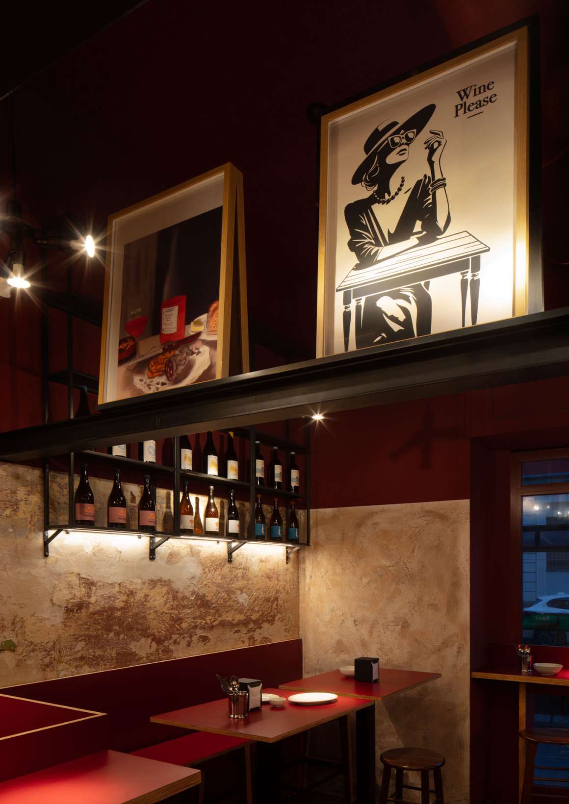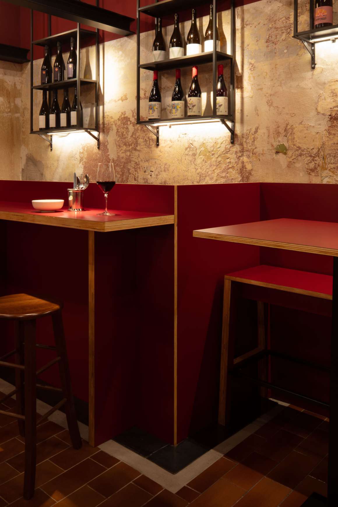 The historical stratification was preserved as the living material of the project. The venue develops longitudinally: the first half hosts tables, wall-mounted support shelves, and high seating , while the second features the bar counter preceding the kitchen. The color palette we chose plays on shades of red, gradations of black, and earth tones , creating a warm and authentic atmosphere. The furniture reflects a quest for sober and functional aesthetics. A distinctive graphic touch is provided by the black and red checkerboard cladding that embraces the bar counter area and the customer restroom. Three steel beams traverse the space at mid-height, serving as an exhibition support for a collection of about thirty vintage and contemporary posters , creating a visual path that is light and ironic.