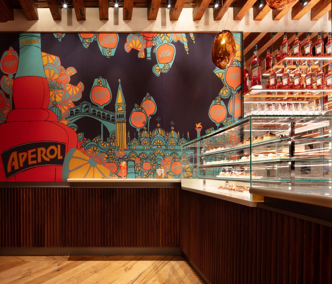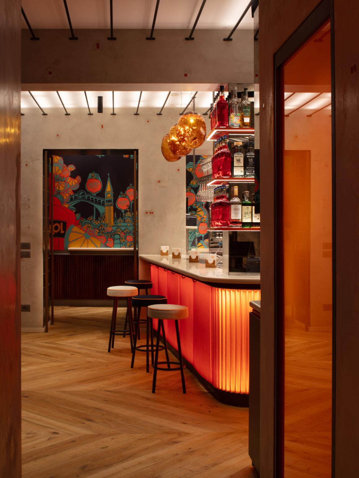 The restyle of Terrazza Aperol in the heart of Venice, in Campo Santo Stefano is a fusion of the traditional bacari, Venice’s tiny local bars, with the contemporary allure of a cocktail bar. Our concept has enhanced the main areas of the Bacaro and the Bar and it has realized the Social Room, a venue that increases the pleasure of socialising in company. Throughout, we have introduced blue details from the Aperol brand identity to lend a further note of personality, teamed with neutrals and details picked out in the typical orange that characterise this project.