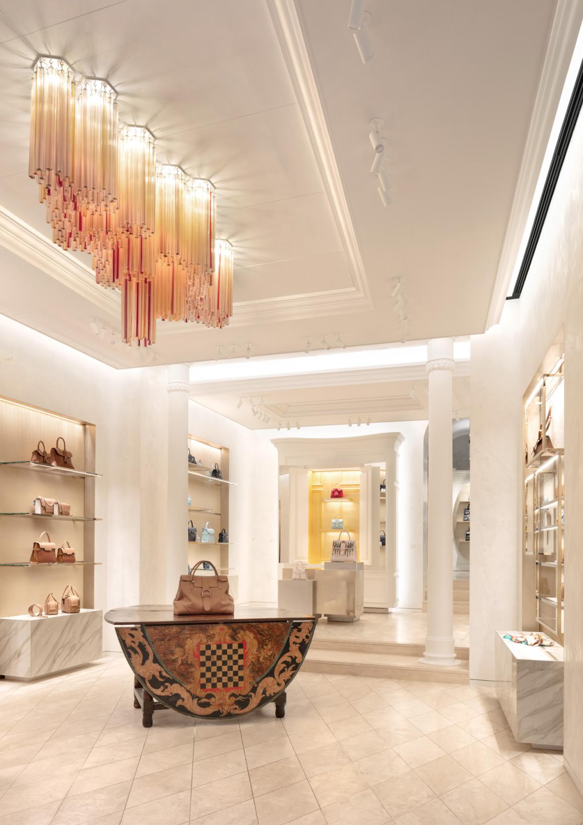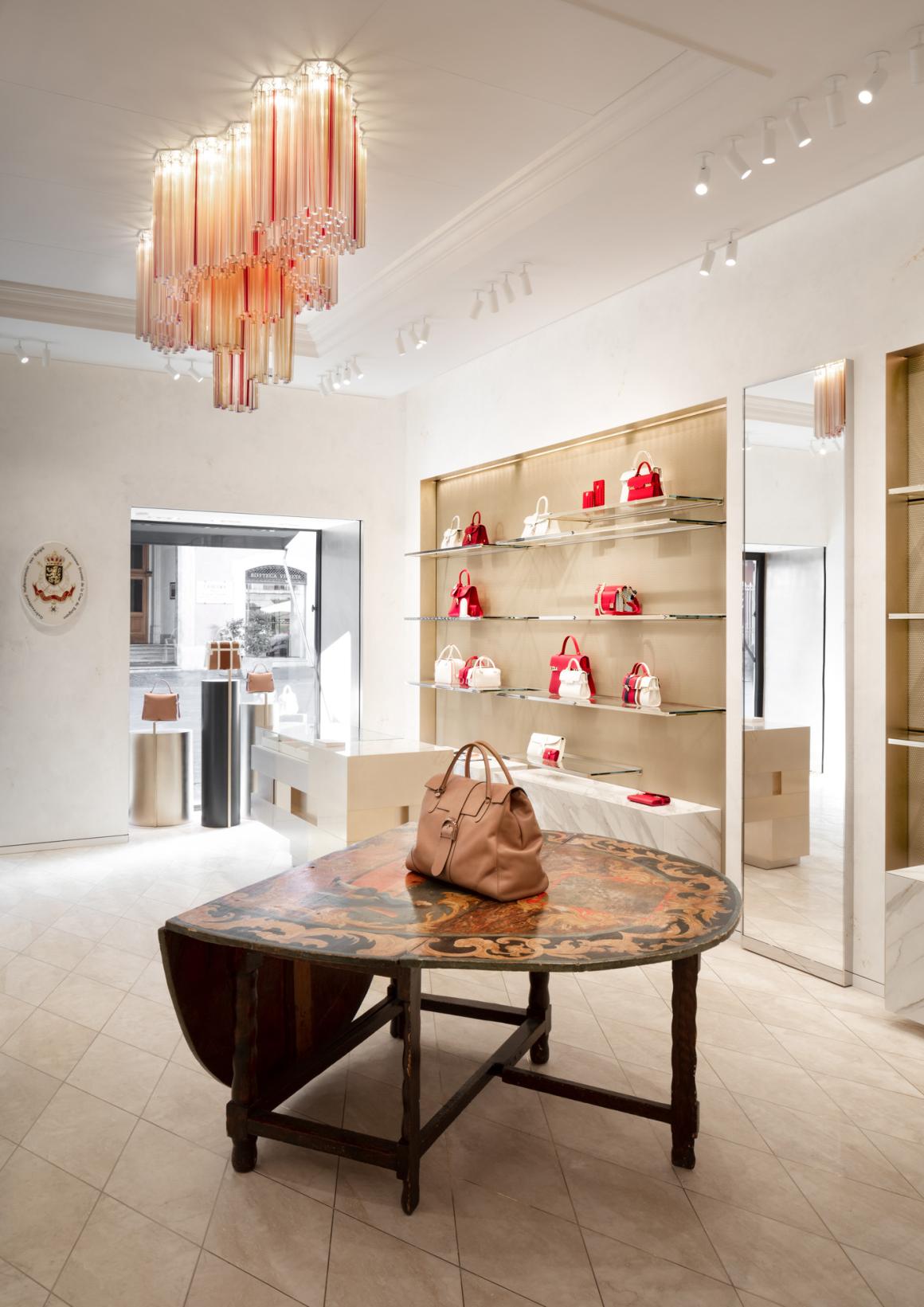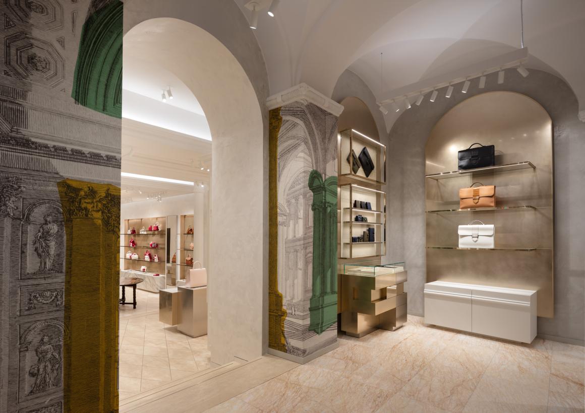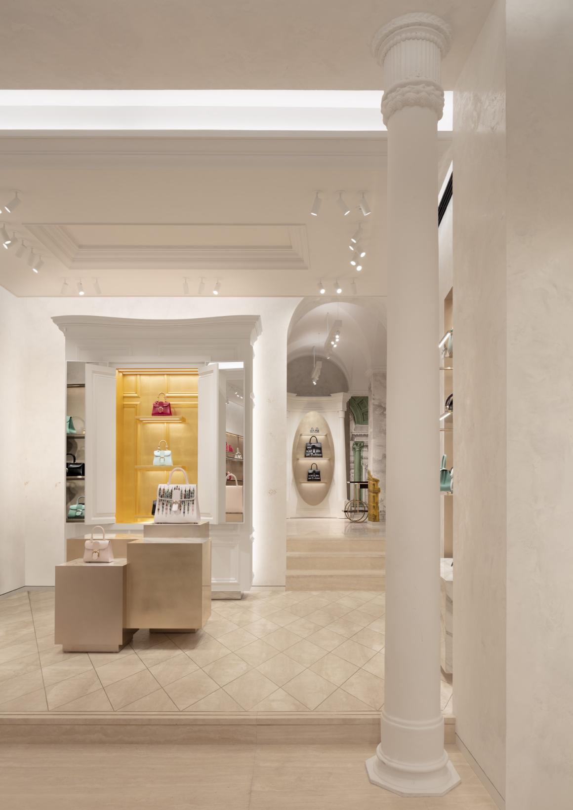 标志性的 Delvaux 衣帽柜,其形态、色彩和体量根据每家门店重新构思,在此次设计中则受到了巴洛克建筑师博罗米尼(Borromini)的启发。这一选择,加上金色背景的运用,旨在向永恒之城罗马致敬。最终呈现的门店拥有独特的、温暖而诱人的个性,其中丰富的引用和暗示引导着宾客探索 Delvaux 的系列产品及其独特的“比利时风情”(Belgitude)。