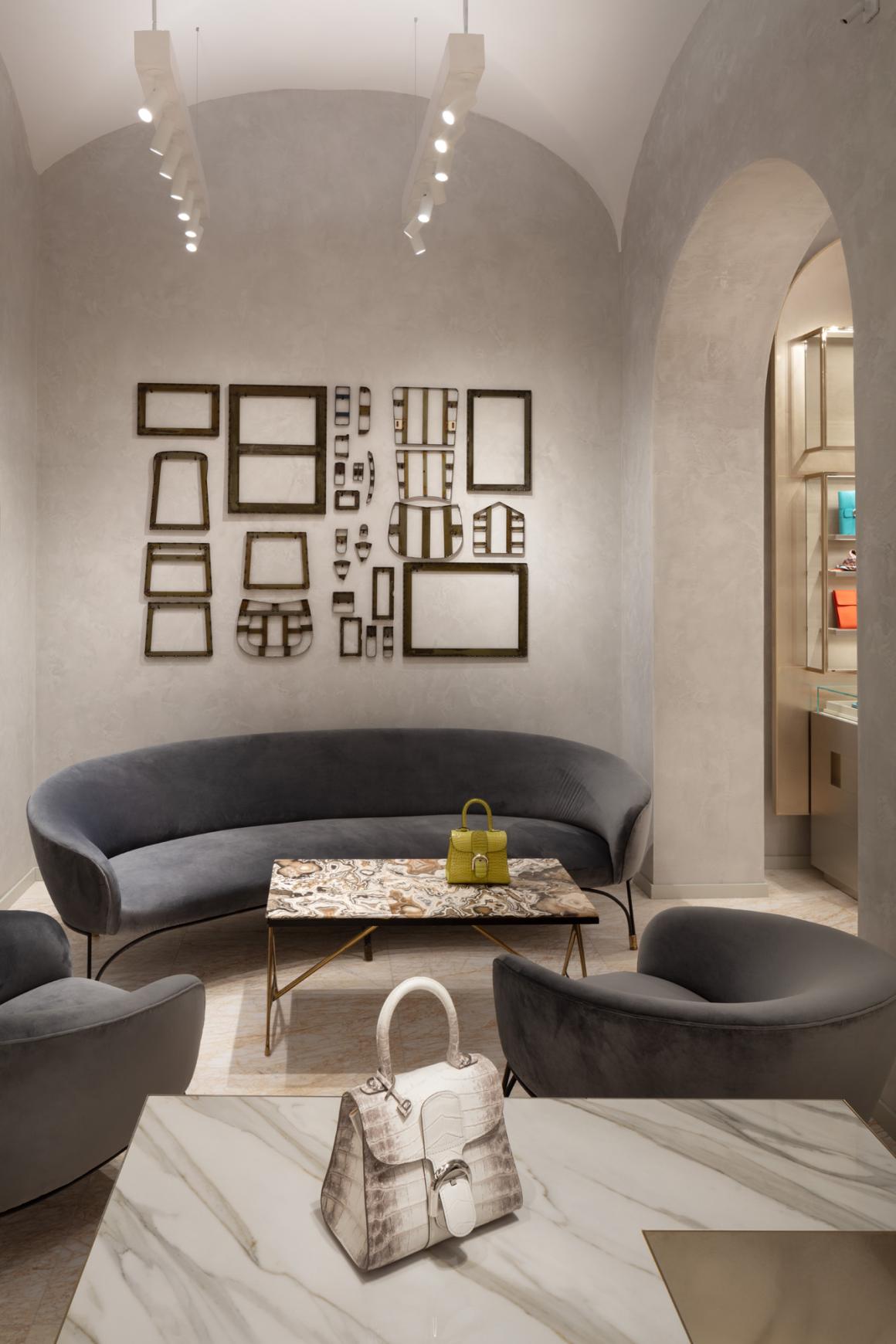Delvaux 罗马旗舰店的主旋律是“罗马之家”(Domus Romana),即古罗马贵族住宅的典范。门店的设计将其布局与传统罗马住宅进行类比,划分为:中庭(入口)、Tablinum(客厅)、Peristylum(私人内院)和Triclinium(餐厅)。这一系列空间从公共空间过渡到越来越私密的空间,营造了一种渐进的探索性购物体验。
